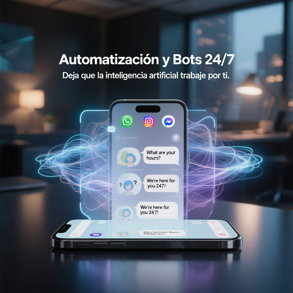 Deja que la inteligencia artificial trabaje por ti. Implementamos bots con IA para Messenger, Instagram y WhatsApp que responden preguntas frecuentes, capturan leads y atienden a tus clientes 24/7. Libera tu tiempo y nunca más pierdas una venta por no contestar a tiempo.